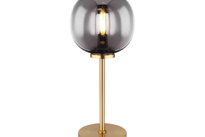 Este candeeiro de mesa de 45 cm é um complemento maravilhoso para os seus interiores. É composto por uma base metálica de latão (ø 15 cm), que também tem uma haste metálica de cor messin. Na parte superior, tem um abajur redondo em vidro fumado (ø 18,5 cm), que pode ser equipado com uma lâmpada E14 à sua escolha. Isto dá-lhe a oportunidade de determinar a cor da luz e a luminosidade de acordo com as suas ideias. Além disso, o cabo de 150 cm de comprimento está equipado com um interrutor incluído, com o qual pode ligar e desligar convenientemente o candeeiro de mesa. Com outros modelos da mesma série, pode criar um ambiente elegante nas suas quatro paredes e completar o quadro geral.