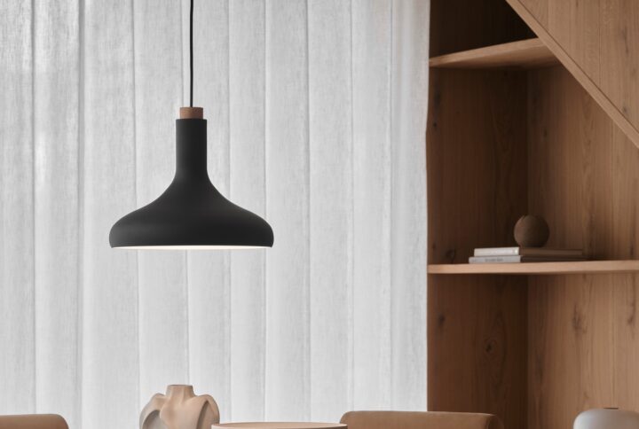 A luminária Fuji, projetada pelo estúdio de design dinamarquês Says Who, encontra seu equilíbrio perfeito na união de dois materiais clássicos. As linhas suaves e orgânicas do tampo de madeira adicionam um toque de aconchego natural ao visual elegante e industrial da cúpula de metal. A Fuji é ideal para ser colocada sobre a mesa de jantar e projeta uma luz agradável e direcionada para baixo.