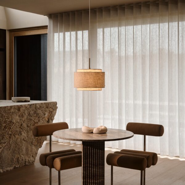 O candeeiro de mesa Takai, do Studio Mavro//Lefèvre, de Sofie Lefèvre, possui um abajur de tecido com um formato belíssimo que convida a ser apreciado de diversos ângulos. A combinação do abajur de linho com a base de latão polido cria uma expressão de design suave e acolhedora.